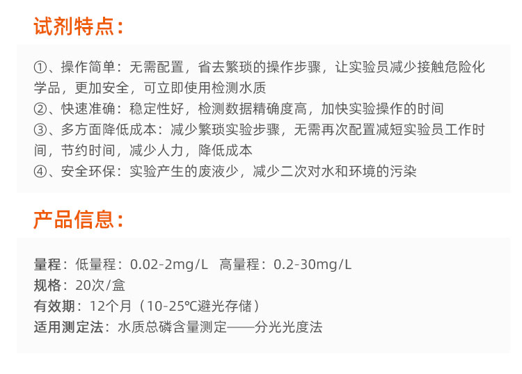 一支一個水樣,省去繁瑣的配置過程,讓實驗員減少接觸危險化學品,更加安全可靠,非專業(yè)人員培訓5分鐘,即可輕松上手