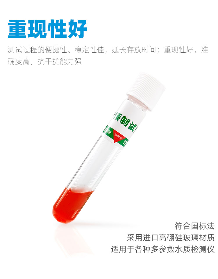 測試過程的便捷性、穩(wěn)定性佳,延長存放時間;重現(xiàn)性好,準確度高,抗干擾能力強,采用進口高硼硅玻璃材質適用于各種多參數(shù)水質檢測儀,作為綠色試劑,減少接觸化學危險品的機會,確保操作人員的身體健康