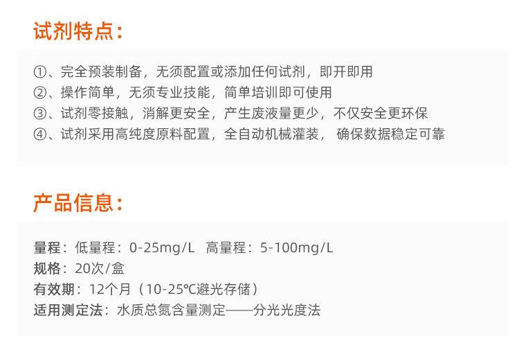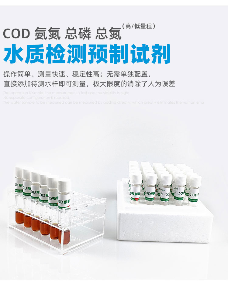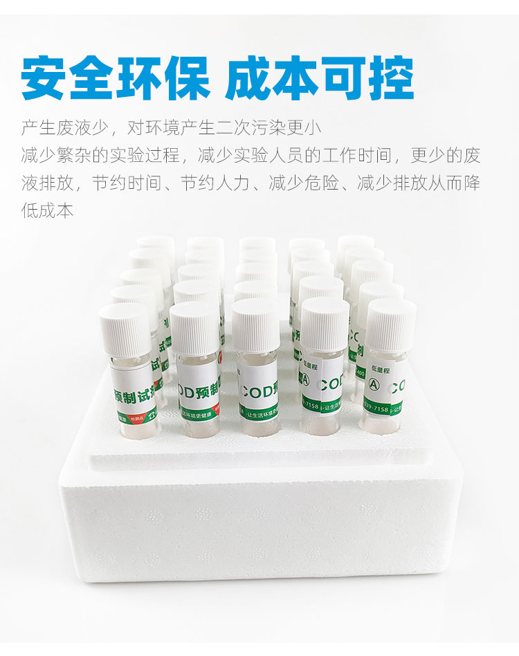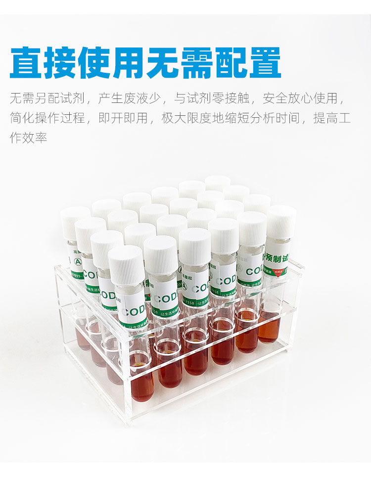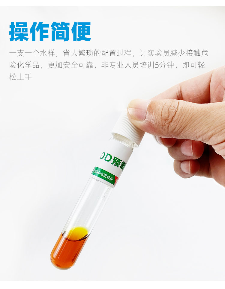 一支一個水樣,省去繁瑣的配置過程,讓實驗員減少接觸危險化學品,更加安全可靠,非專業(yè)人員培訓5分鐘,即可輕松上手